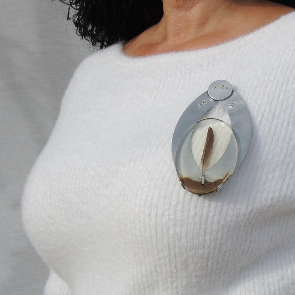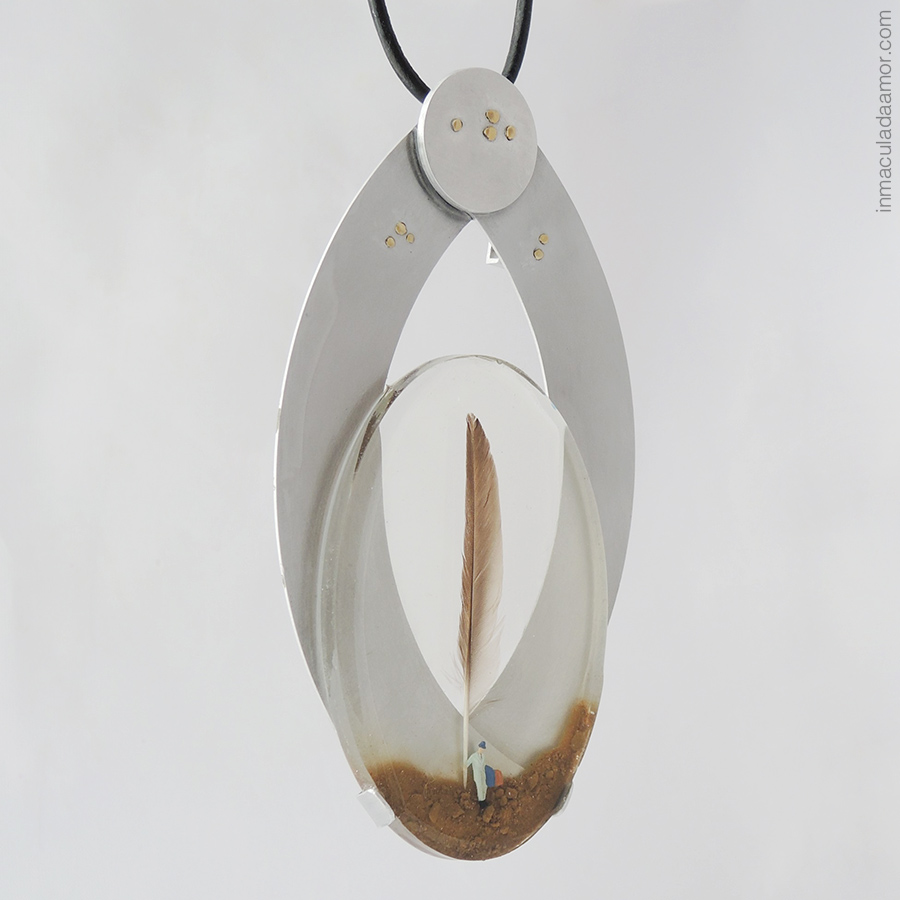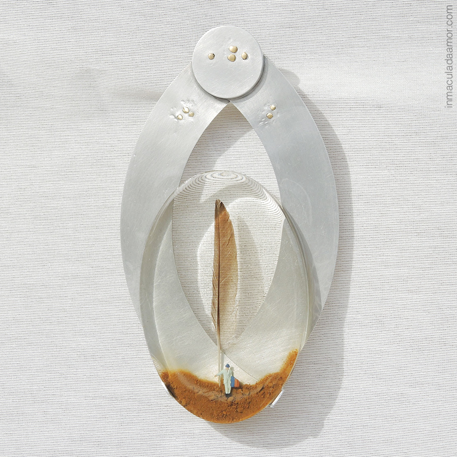 Las obras de este proyecto nos hablan de viajes y viajeros, plasmados en escenas formadas a modo de poemas visuales, inspirados en escenarios oníricos. Además de disfrutarlas con la mirada y el tacto, se pueden llevar puestas sobre uno mismo, porque están pensadas para poderlas llevar sobre el cuerpo como broches o colgantes.